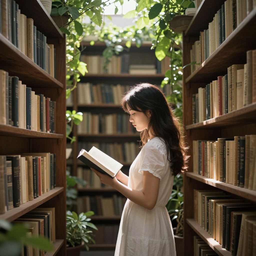 Photograph of a young woman with long, wavy brown hair, wearing a white, short-sleeved, lace dress, standing between two tall wooden bookshelves filled with books. She is reading a book with a glowing, white light illuminating its pages. Sunlight filters through green leaves hanging from the shelves, casting dappled light and shadows. The background shows more bookshelves filled with books, creating a cozy, library-like atmosphere. Her profile is visible, and she appears focused on the book, with a serene and contemplative expression.