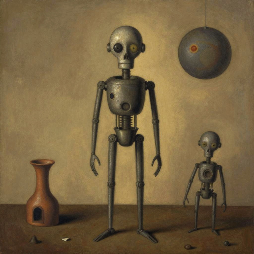 Surreal and ominous character, inspired by Paul Klee, with mechanical and synthetic elements, creating a haunting, warm-toned atmosphere