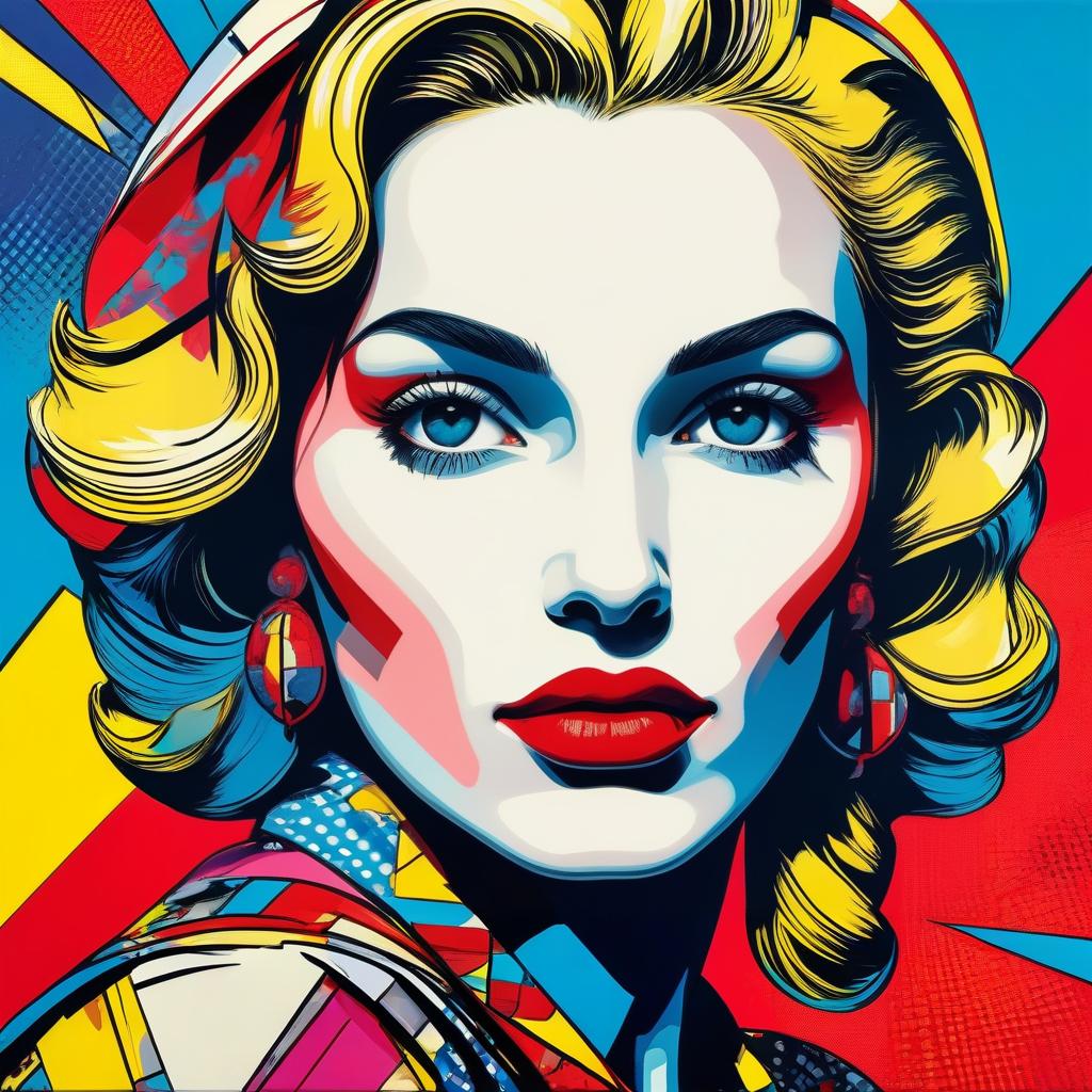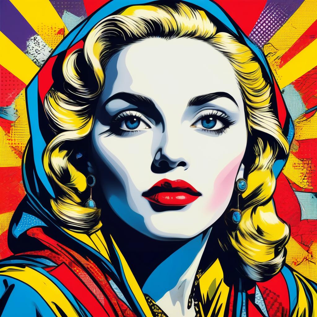 Pop art style portrait of a Madonna in bold, vibrant colors, comic book influence, iconic expression, inspired by Lichtenstein-inspired.