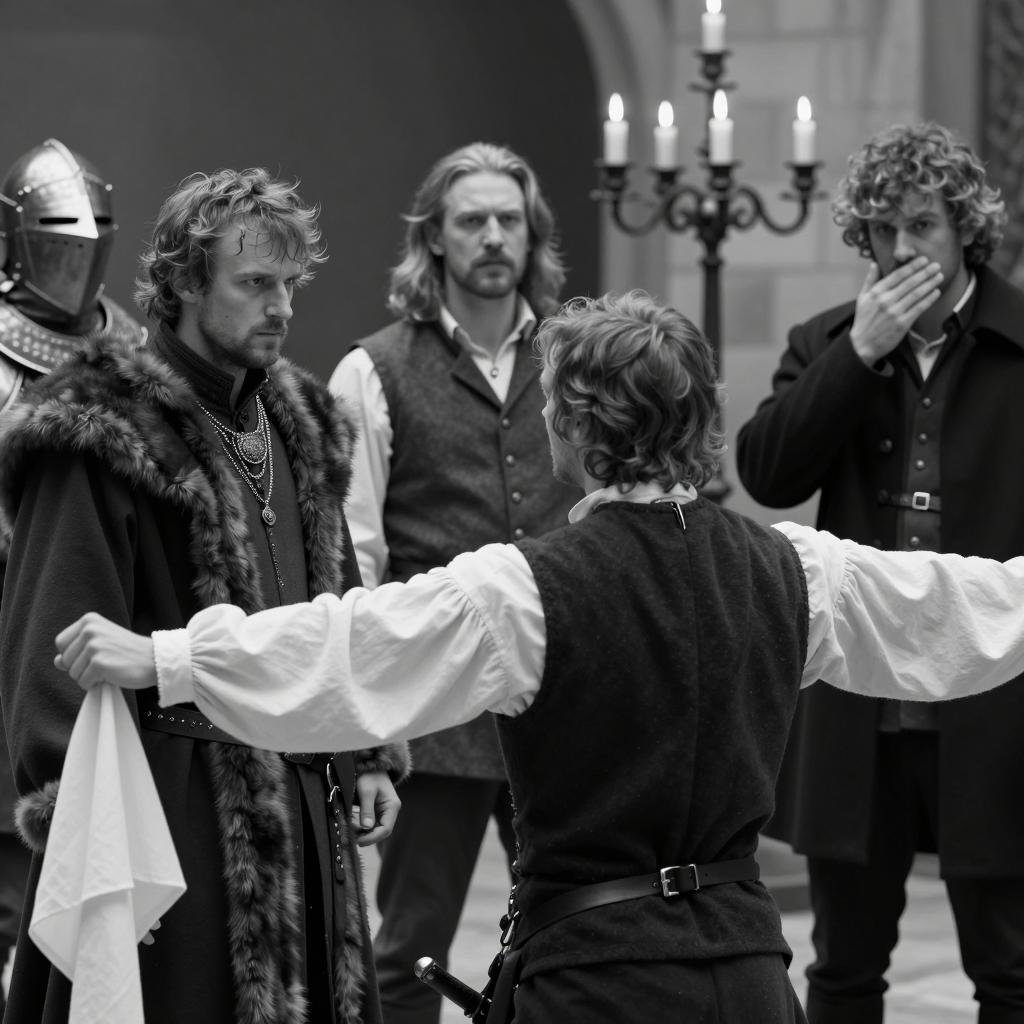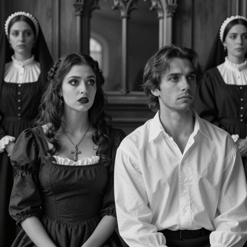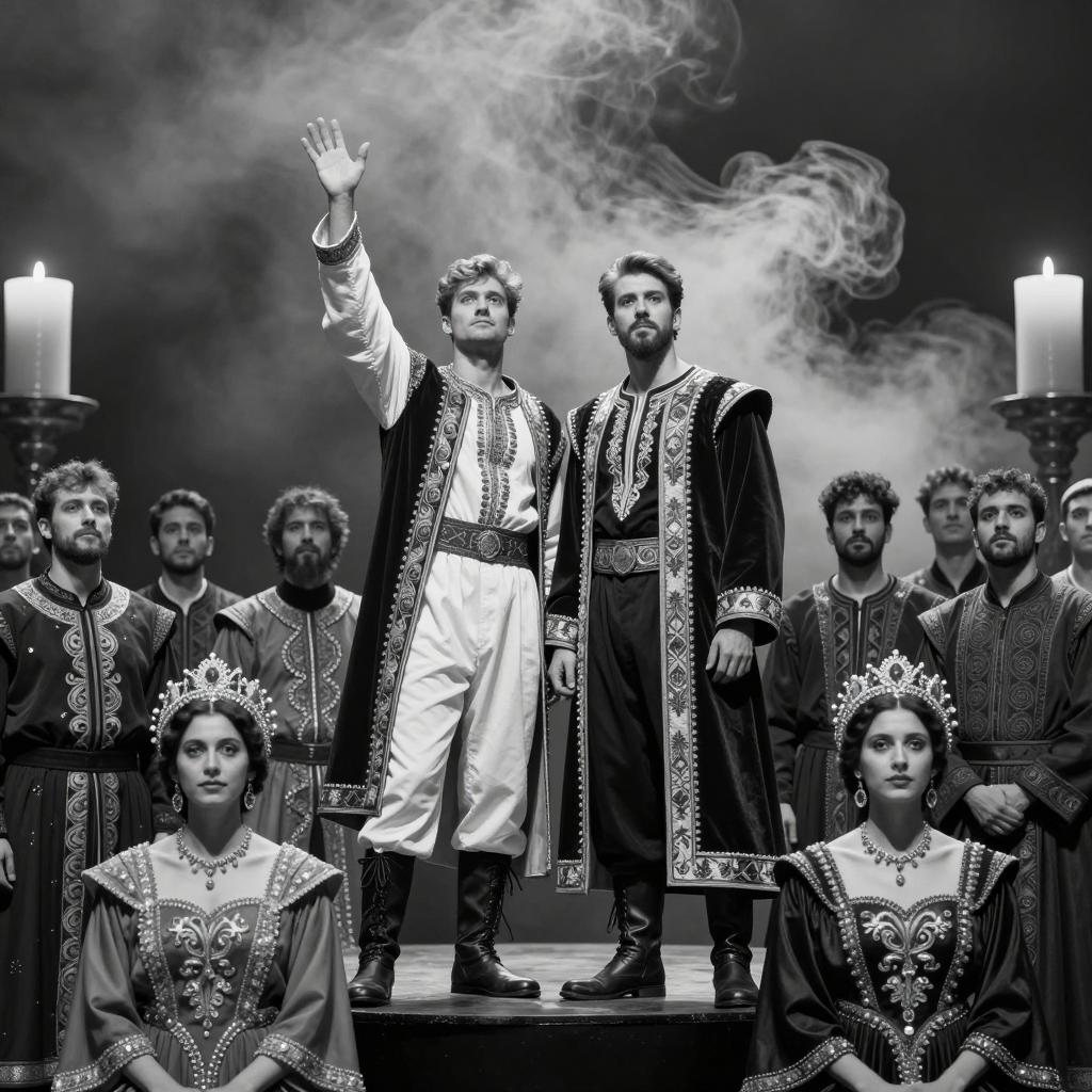 Black and white photograph. Two men in center, one with raised arm, wearing ornate costumes, standing on raised platform. Smoky background. Surrounding them, several men in dark robes with ornate patterns. Two women in ornate headpieces and garments in foreground. Large candle-like objects on either side. Smoke rising from central background. Total of 12 people. Dramatic, intense expressions.