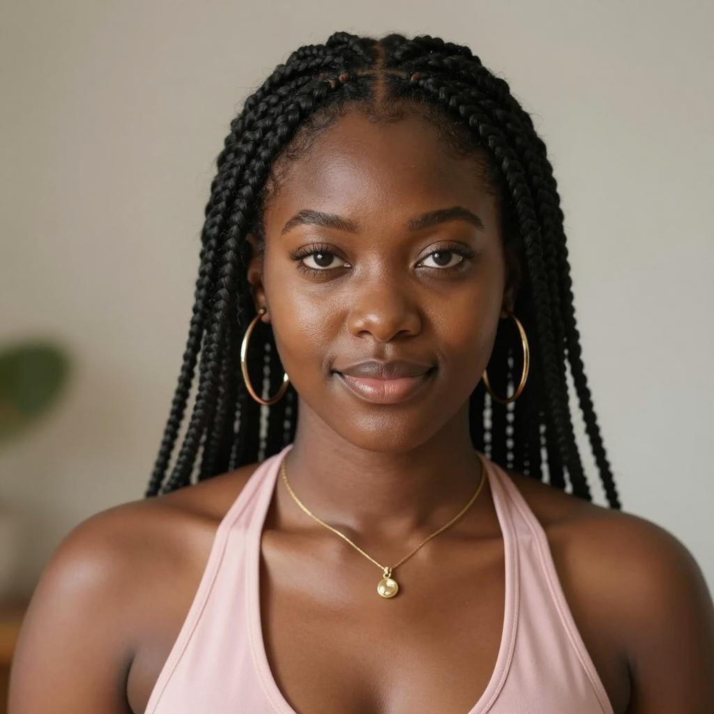 A beautiful black teenage girl with braided hair sitting cross-legged on a beige sofa, wearing light gray lounge wear. She is holding and eating a snack while looking away from the camera in a cozy home setting.