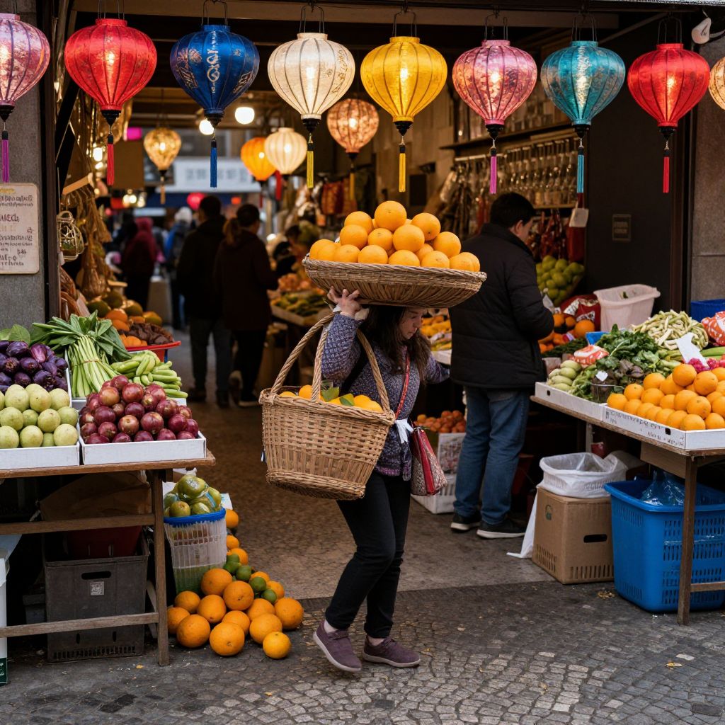 Photograph of a bustling market stall with colorful lanterns, a woman in a patterned jacket balancing wicker baskets of oranges, surrounded by vibrant fruits