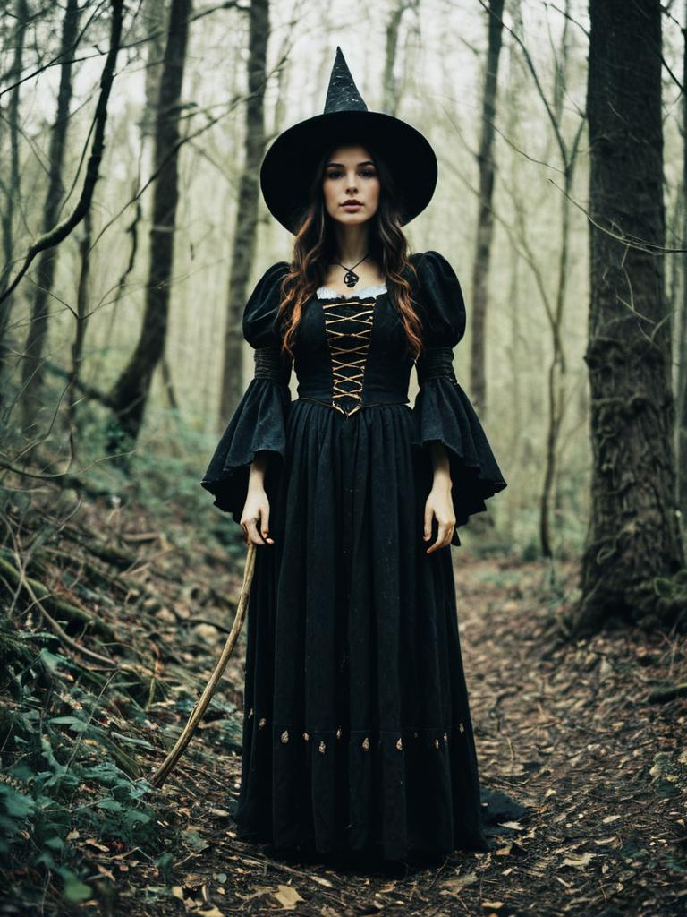 Portrait of a young woman dressed in a black woodland witch costume, featuring a pointed hat and long dress with lace details, standing on a forest path surrounded by tall trees. The scene has a cinematic, magical realism mood.