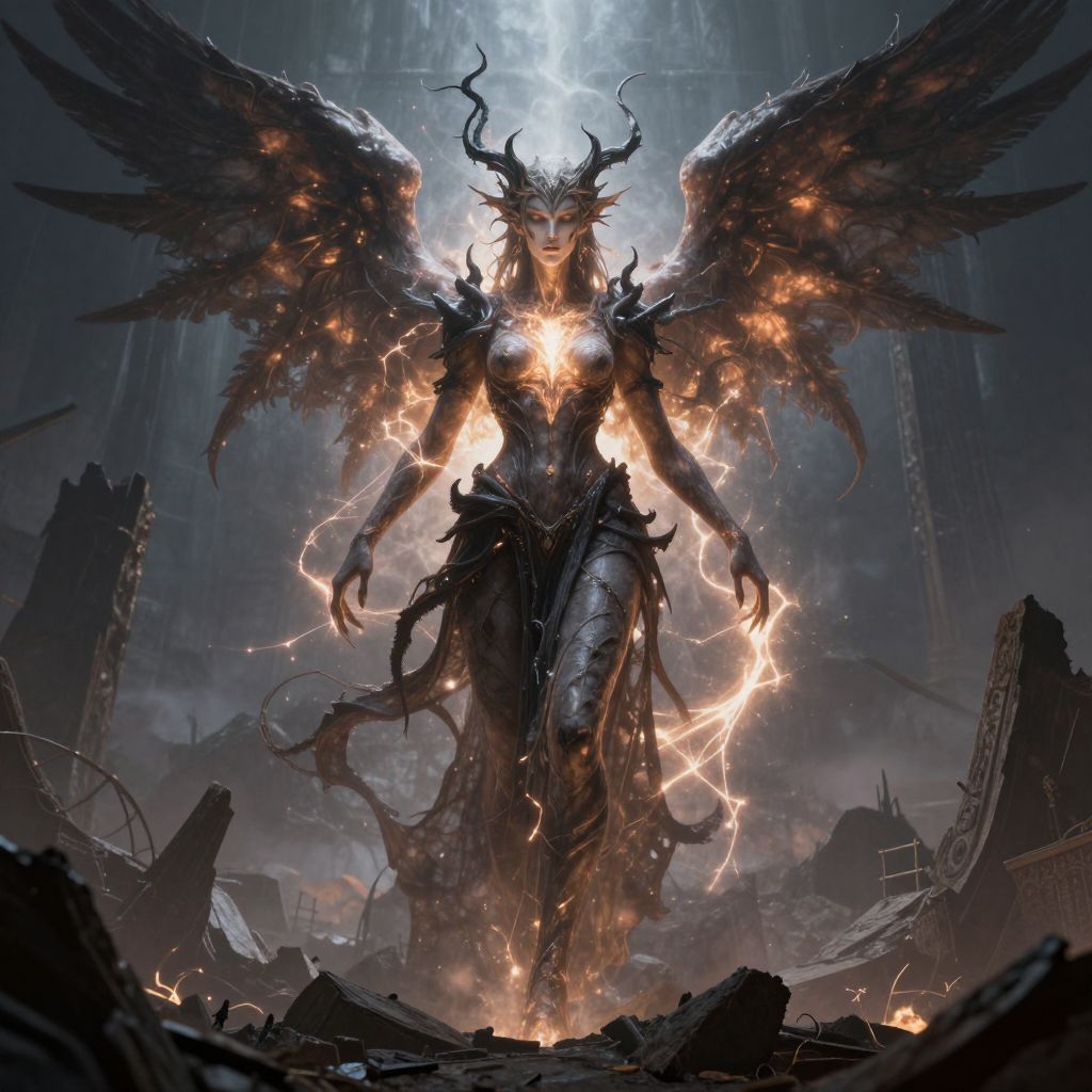 Digital artwork depicting a powerful, demonic female figure with glowing orange eyes and black, fiery wings. She has a horned crown, sharp claws, and wears a tattered, metal armor dress. Her body is illuminated by intense, crackling energy emanating from her chest. The background is a dark, ruined industrial setting with broken machinery and debris, enveloped in smoke. The light from behind her highlights her menacing and imposing presence. The overall style is dark fantasy with a high level of detail and dramatic lighting.