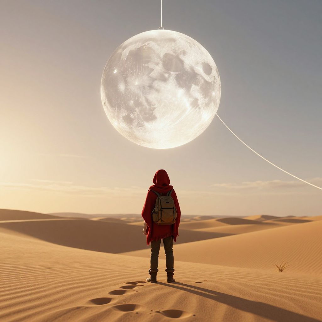A surreal 3D-rendered desert landscape bathed in golden hour lighting, featuring a solitary traveler draped in a red shawl, carrying a backpack, and gazing at a luminous, oversized moon suspended by a glowing tether, evoking a dreamlike, cyberpunk-inspired atmosphere where celestial bodies and human journeys intertwine.