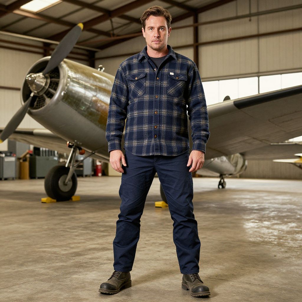 A man, heavy-duty flannel shirt, flexible work chinos, steel-toe ankle boots, deep navy blue, vintage aircraft on display, polished metal fuselages, expansive hangar space, warm sepia tones, focused expression. Man has masculine face and piercing eyes