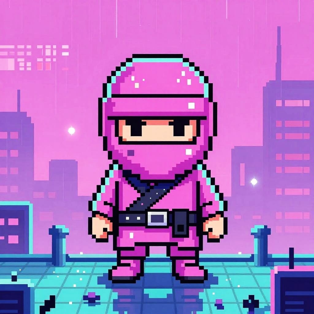 Pixel art cyberpunk ninja visage in rain-soaked neon rooftop, using hot pink and cyan 16-color palette, retro 8/16-bit arcade vibe, sharp pixel edges, clean 1px outlines, deliberate checker dithering, subtle CRT bloom and scanlines, layered parallax tiles, soft pastel haze, tiny HUD glyphs, subpixel highlights on key features, balanced contrast, centered portrait sprite, reflections and light glints, consistent tile seams, nostalgic game intro energy