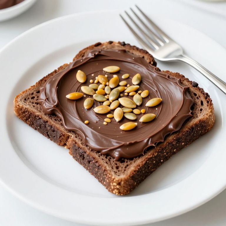 Delicious chocolate toast recipe featuring a slice of dark bread spread generously with smooth chocolate spread, topped with a scattering of golden pumpkin seeds, served on a pristine white plate alongside a silver fork.