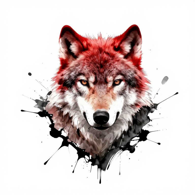 White background, a Wolf's head breaks through the background, the top half of the Wolf's head is a big splash of red ink, the bottom half of the Wolf's head is a big splash of black black ink, ink rendering