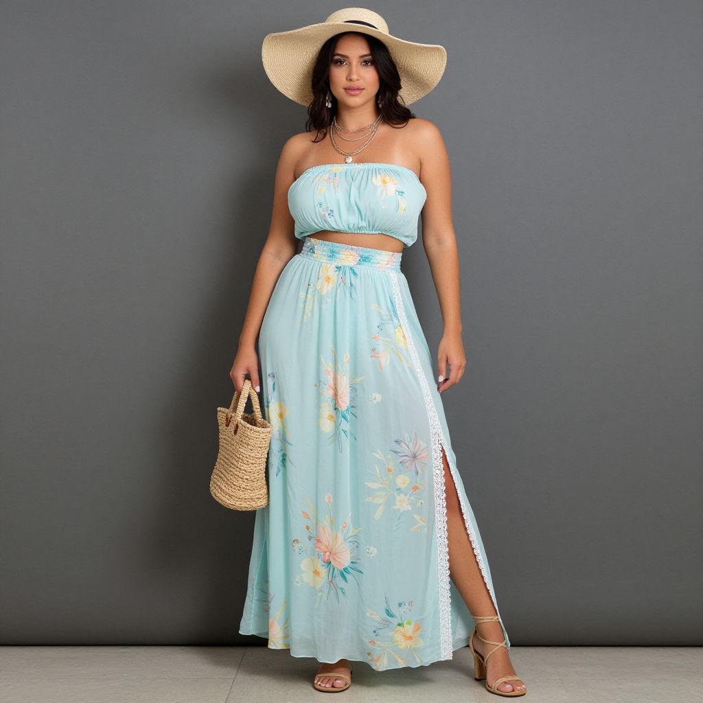 Photograph of a woman with medium-dark skin and wavy black hair, wearing a large beige sunhat, strapless light blue top with ruffled fabric, and a high-waisted, floral-patterned, light blue maxi skirt with a thigh-high slit. She holds a woven straw handbag in her right hand and wears beige strappy sandals. The background is a solid dark gray, and she stands on a light gray floor. Her expression is neutral, and she exudes a casual, summer style.