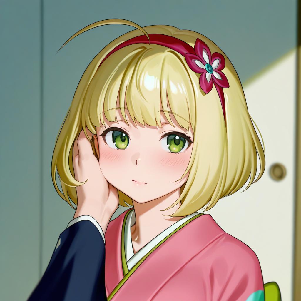 Moriyama shiemi, ao no exorcist, 1girl, green eyes, blonde hair, short hair, ahoge, hairband, kimono, by artist nia (nia4294), illustrious