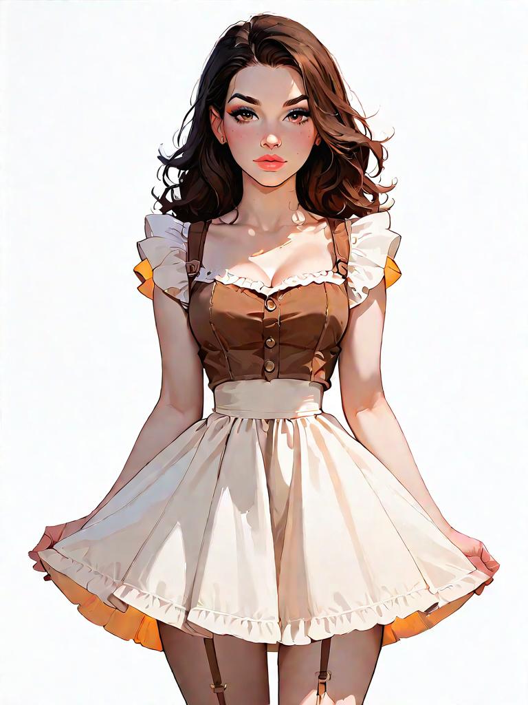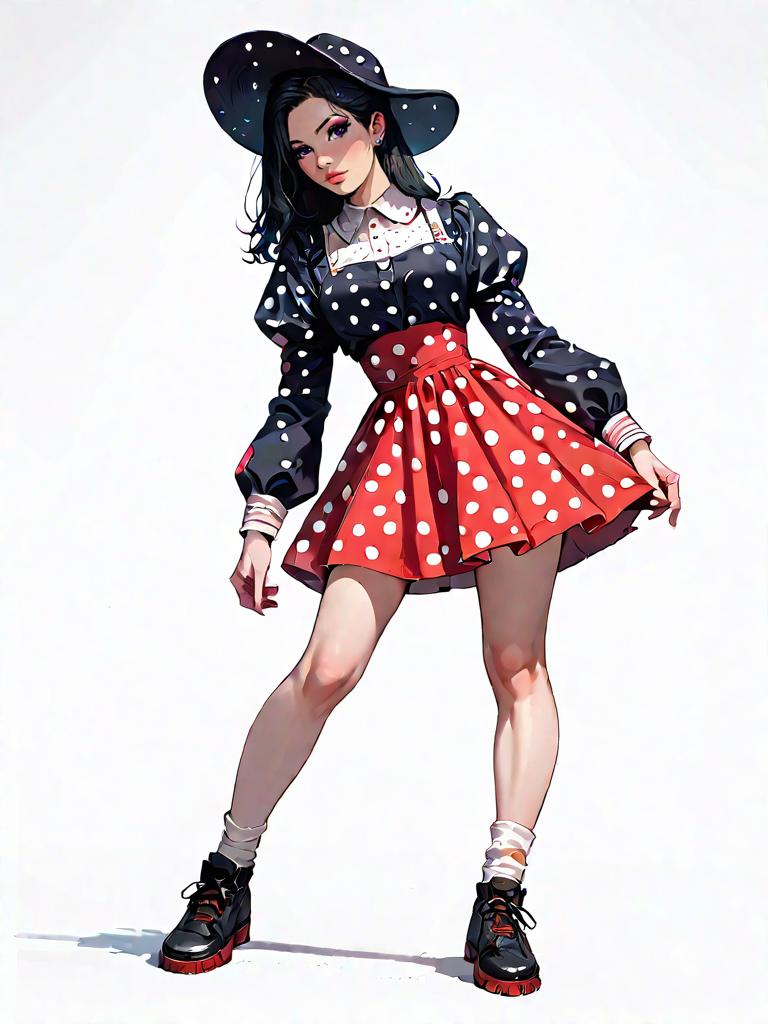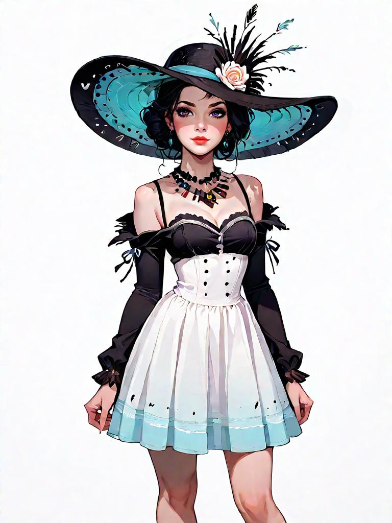 1girl, source_comics, realistic face, full body shot, Woman, boho chic, black mini dress with eyelet embroidery, sweet-heart neckline, off-the-shoulder tie sleeves, a-line skirt, lace trimming at hem, layered necklaces, wide-brimmed taupe hat, white background