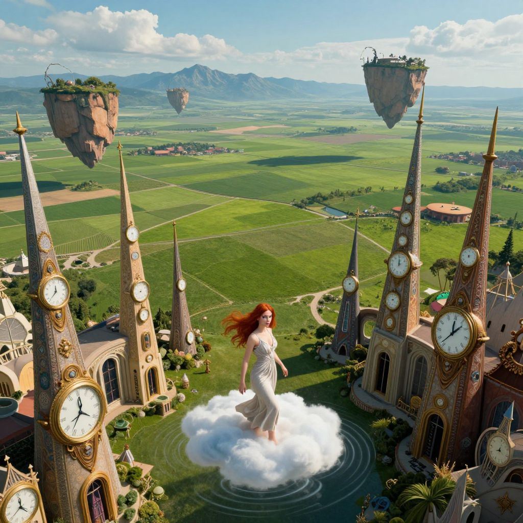 A dreamlike landscape unfolds with grandiose architecture reminiscent of Salvador Dali's surreal visions, its spires adorned with fantastical timepieces in various states of distortion. From an aerial viewpoint, sprawling emerald fields stretch out towards the horizon, where distant mountains transform into floating landmasses suspended in midair. A lone enigmatic figure, a woman with cascading red hair and mesmerizing blue eyes, traverses a cloud, her each step creating ripples akin to water's surface. The color palette is both vivid and subdued, instilling an aura of tranquility mixed with intrigue, as if beckoning the observer to venture into this whimsical realm and uncover its enigmatic secrets.