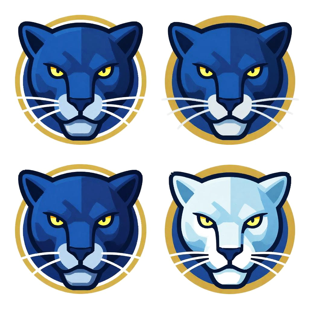 Digital illustration of four stylized panther heads, each with yellow eyes, white whiskers, and blue or white fur, in golden circles.