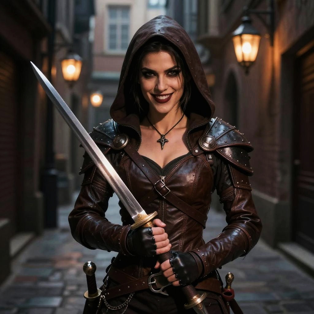 Dnd female portrait featuring a cunning rogue with a mischievous smile, short cropped hair, wearing dark leather armor and a hood, dual daggers in hand, shadowy urban alley setting with flickering lanterns, rich textures and dramatic lighting