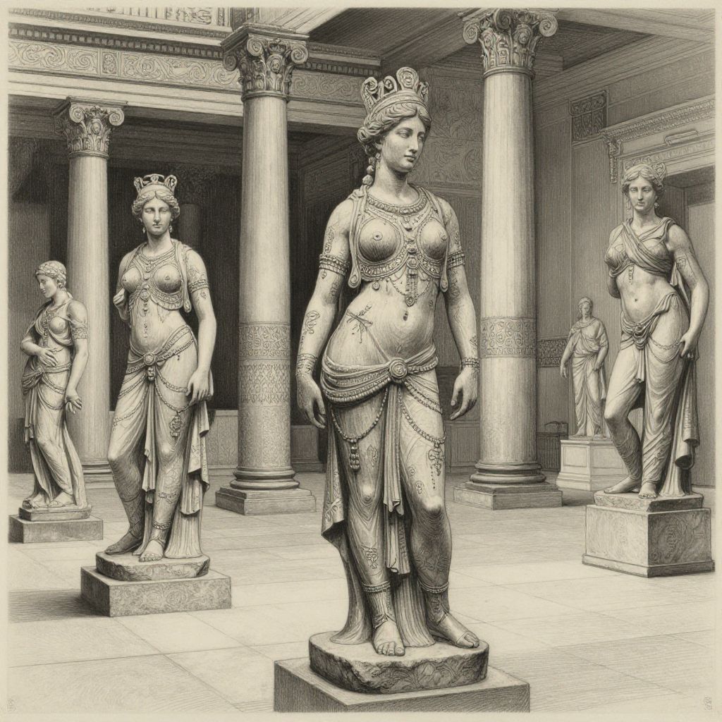 The image depicts a detailed charcoal drawing of a gallery of ornate statues in stone ruins, reminiscent of the work of Moebius. The scene is set in a classical architectural setting, with tall, slender columns and intricate stonework. The statues, rendered in a realistic style, are adorned with elaborate clothing and accessories, showcasing a high level of craftsmanship. The foreground features a central statue of a woman, standing gracefully with a serene expression, her body adorned with intricate tattoos and jewelry. To the left, another statue, possibly a male figure, stands in a similar pose, adding to the symmetry of the composition. The background reveals additional statues and architectural elements, creating a sense of depth and scale. The overall color palette is monochromatic, with shades of gray and black, emphasizing the texture and detail of the charcoal medium. The composition is balanced, with the statues and columns arranged in a harmonious manner, inviting the viewer to explore the intricate details of this classical scene.