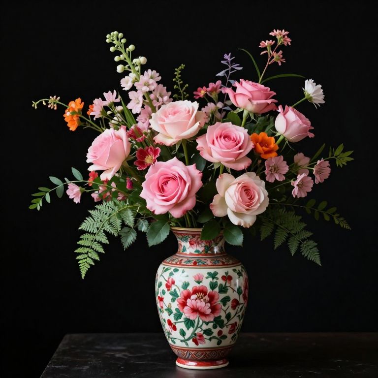 The image showcases a stunning vase of flowers by Hiroyuki Mitsume Takahashi, set against a black background with Rembrandt lighting that highlights the intricate details. The vase, positioned centrally, is adorned with a floral pattern in shades of red, pink, and green, and is filled with a vibrant assortment of flowers. Among the blooms, there are large pink roses, delicate pink and orange flowers, and various greenery, including leaves and stems. The arrangement is dynamic, with some flowers spilling over the edge of the vase, creating a sense of movement and abundance. The overall composition is harmonious, with the flowers and vase interacting in a balanced manner, and the black background providing a stark contrast that accentuates the colors and textures of the flowers. The high depth of field ensures that all elements are in sharp focus, from the intricate patterns on the vase to the fine details of the petals and leaves. The image is photorealistic and hyperdetailed, capturing the essence of the scene with remarkable precision.