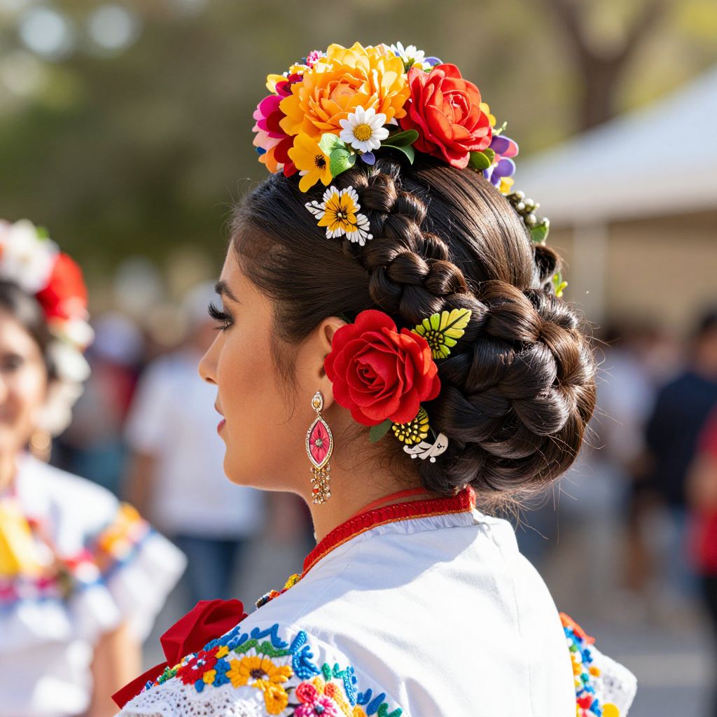 Mexican female hairstyles featuring elegant updos with floral crowns and delicate twists, inspired by folkloric fashion, vivid patterns, bright colors, sunlit outdoor setting, detailed textures, photorealistic style