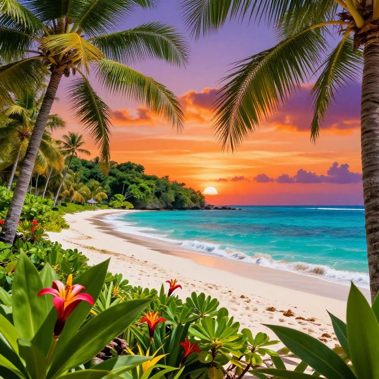 Natura tropical paradise with exotic plants and flowers, turquoise ocean waves gently touching white sandy beach, vivid sunset sky blending oranges and purples, lush greenery framing the scene, detailed textures capturing the vibrant natural beauty vividly