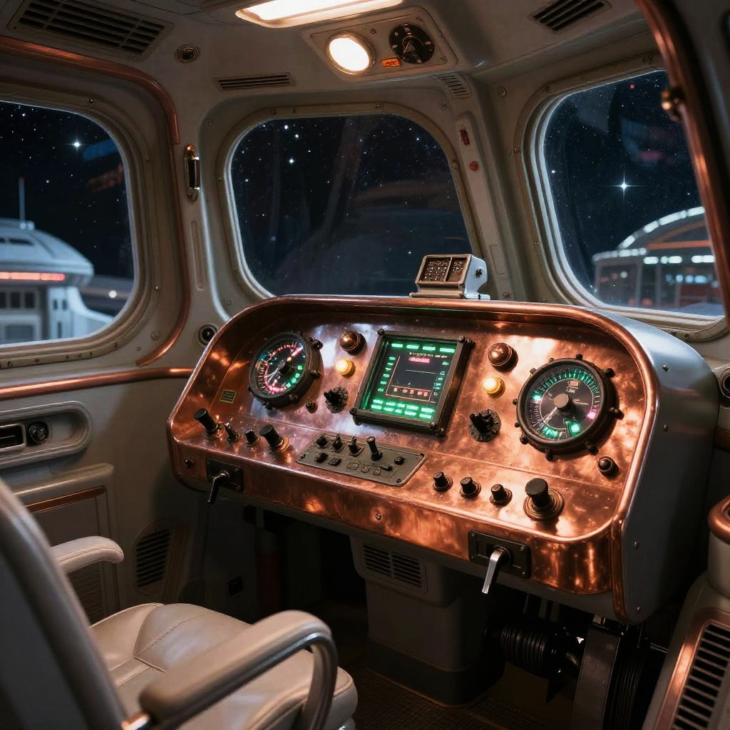 Raypunk aesthetic interior of a retro spaceship cockpit, polished copper and glass instruments with blinking lights, classic toggle switches and oversized dials, starry expanse visible through round windows, blending nostalgia for early sci-fi with sleek futuristic design.