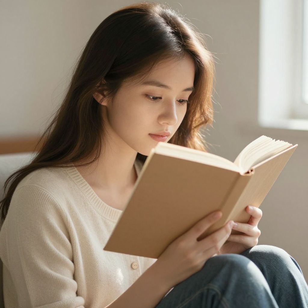 Photograph of a young woman with fair skin and brown hair, wearing a cream sweater and blue jeans, reading a brown book in a sunlit room