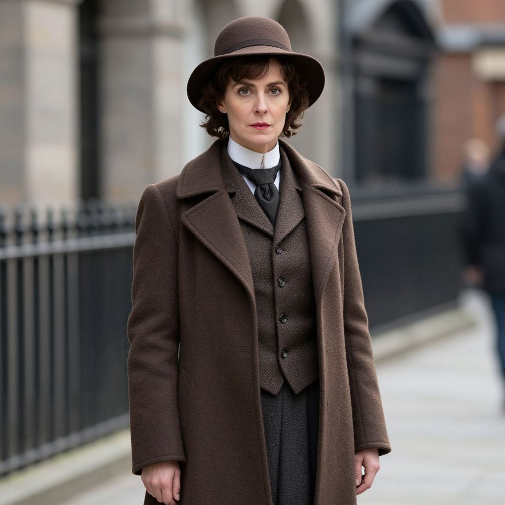 Photograph of a young woman standing outdoors in a Victorian-style outfit. She has pale skin, dark brown curly hair, and wears a brown felt hat. Her attire includes a brown woolen overcoat, a three-piece brown tweed suit, a white shirt, and a black tie. The overcoat is long and slightly oversized, with a large collar. She stands in front of a blurred background featuring a black iron fence and stone building. The lighting is natural, and the overall tone of the image is slightly muted, giving a historical or period drama feel.