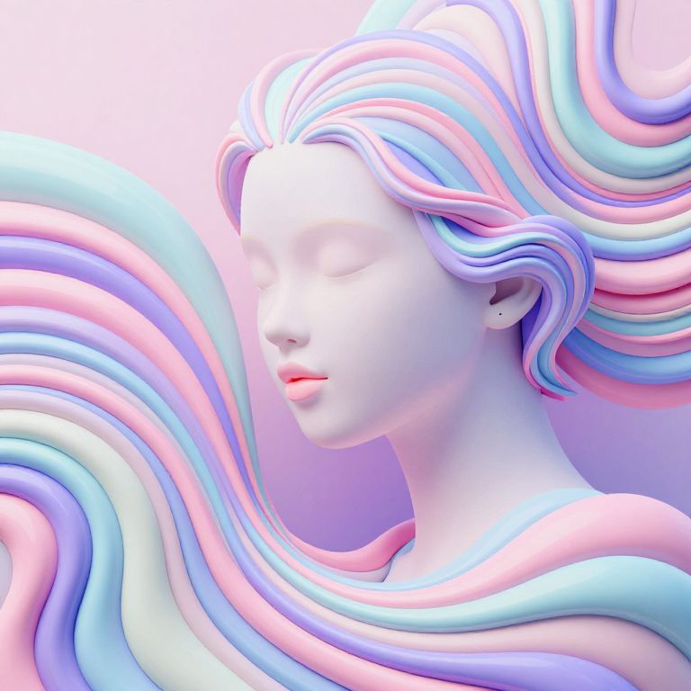 Keyframe minimalist background with flowing lines in brilliant pastell , psychedelic curves and swirls beautiful female face growing out of the background into 3D::2,