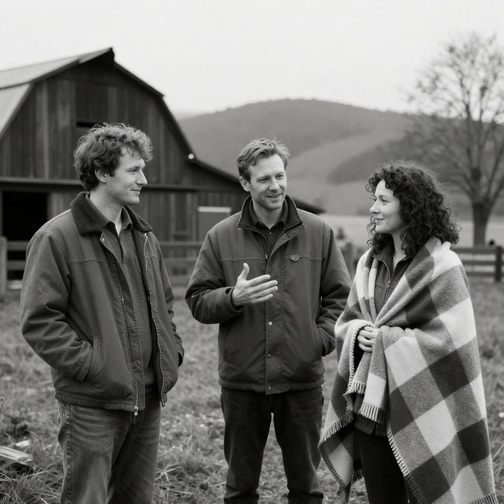 Black-and-white photograph of two people pruning grapevines outdoors. The person in the foreground, with shoulder-length blonde hair, wears a dark jacket and jeans, focusing on cutting vines. The person in the background, with curly hair, wears a scarf and dark clothing, observing. A brick building is in the background.