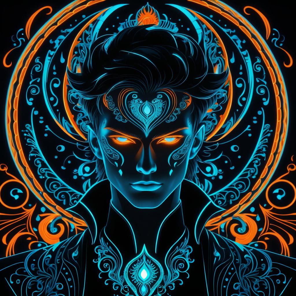 Embroidery Trim it appears to be a beautiful man in black with glowing eyes, in the style of psychedelic graphic design, dark cyan and orange, youthful energy, illuminated visions, angelcore, 3840x2160, scientific illustrations,