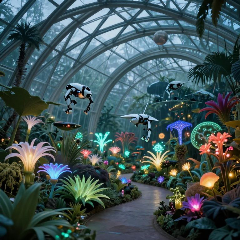 Neumar botanical garden inside a glass dome on an alien planet, exotic luminous plants and flowers, soft bioluminescent glows illuminating the space, serene atmosphere with hovering robotic gardeners tending to flora.