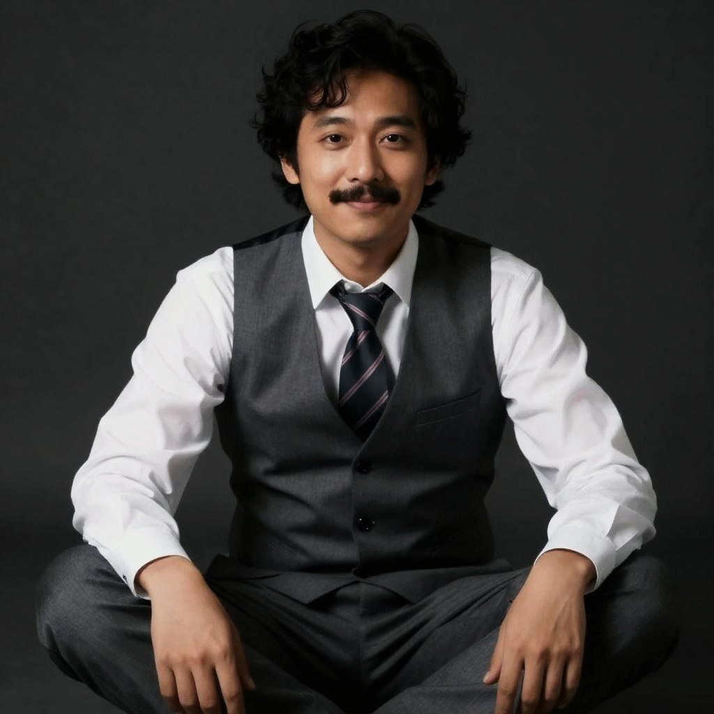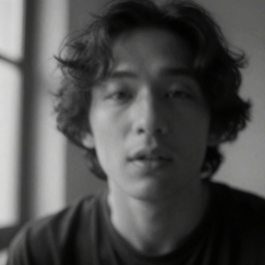 Photograph of a man with curly black hair, light skin, and a slight smile. He wears a light gray V-neck shirt. He looks to the right with a relaxed expression. Gray background with a partially visible door on the right.