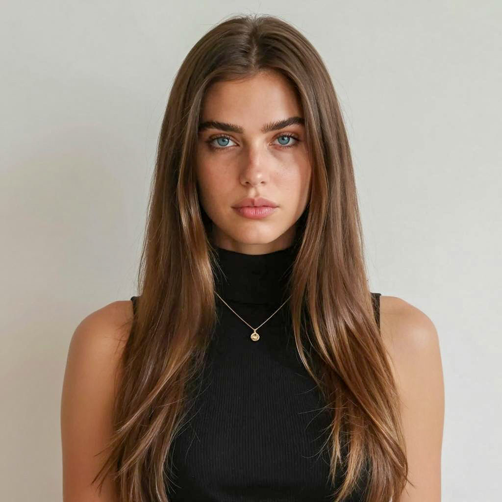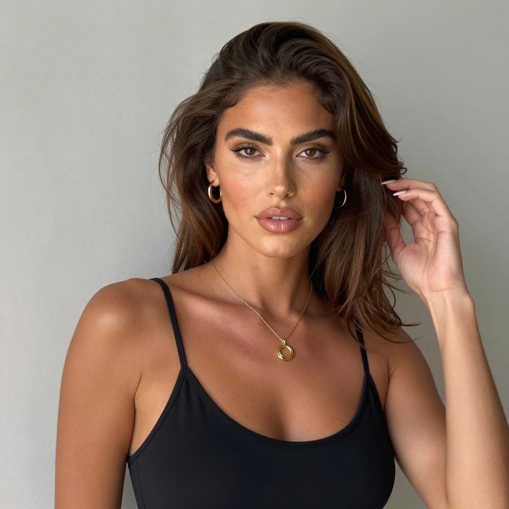 Photograph of a woman with long, wavy, brown hair, green eyes, and light makeup. She wears a black sleeveless top, sitting on a white couch. Her expression is neutral, lips slightly pursed. She has small diamond earrings and a silver bracelet. Background includes dark wooden furniture and a plant.