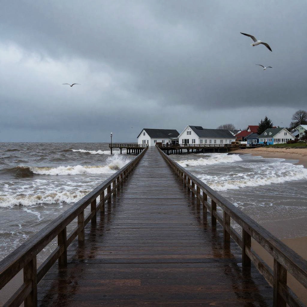 Rainy dark day in a small seaside town, waves crashing against the shore, empty wooden pier slick with rain, cloudy sky casting a gloomy tone, seagulls flying low, evoking a sense of solitude and reflection.