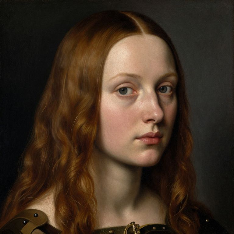 This is a digital painting of a young woman with fair skin, blue eyes, and long, wavy, reddish-brown hair. She has a serene expression with slightly parted lips. She wears a dark, possibly leather garment with visible stitching and a small, gold decorative clasp at the neckline. The background is a solid, dark gray, which contrasts with her light skin and hair. The lighting highlights her facial features, casting soft shadows that add depth to the image. The style is realistic with a slight romanticism, focusing on detailed textures and subtle color gradients.