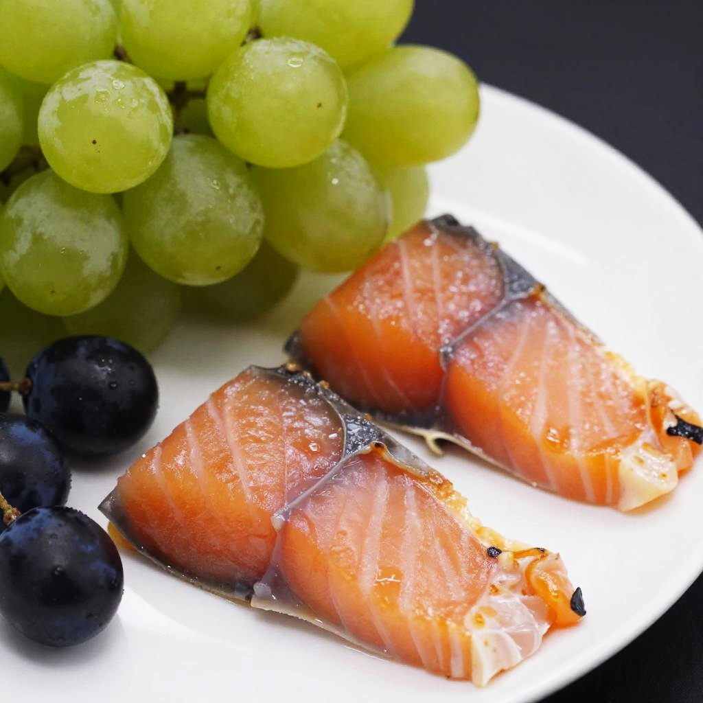 Close-up image of a white plate featuring two slices of smoked salmon with an orange-pink hue, accompanied by a bunch of fresh green grapes and several black grapes. The background is black, emphasizing the vibrant colors of the food.