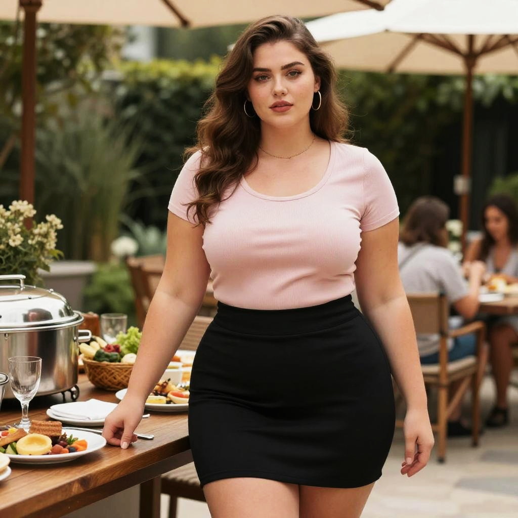 A lanky woman in a casual chic style, wearing a pale pink ribbed scoop-neck t-shirt tucked into a high-waisted black mini skirt, standing at a breakfast buffet in a serene garden patio, drawn and quarterly visual style. Sexy. Pretty face and beutiful eyes