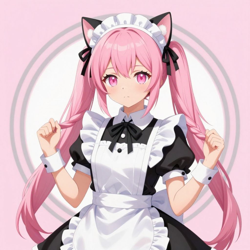 Anime-style digital illustration of a pink-haired girl with cat ears, wearing a black and white maid outfit, holding her long twin-tails, with a