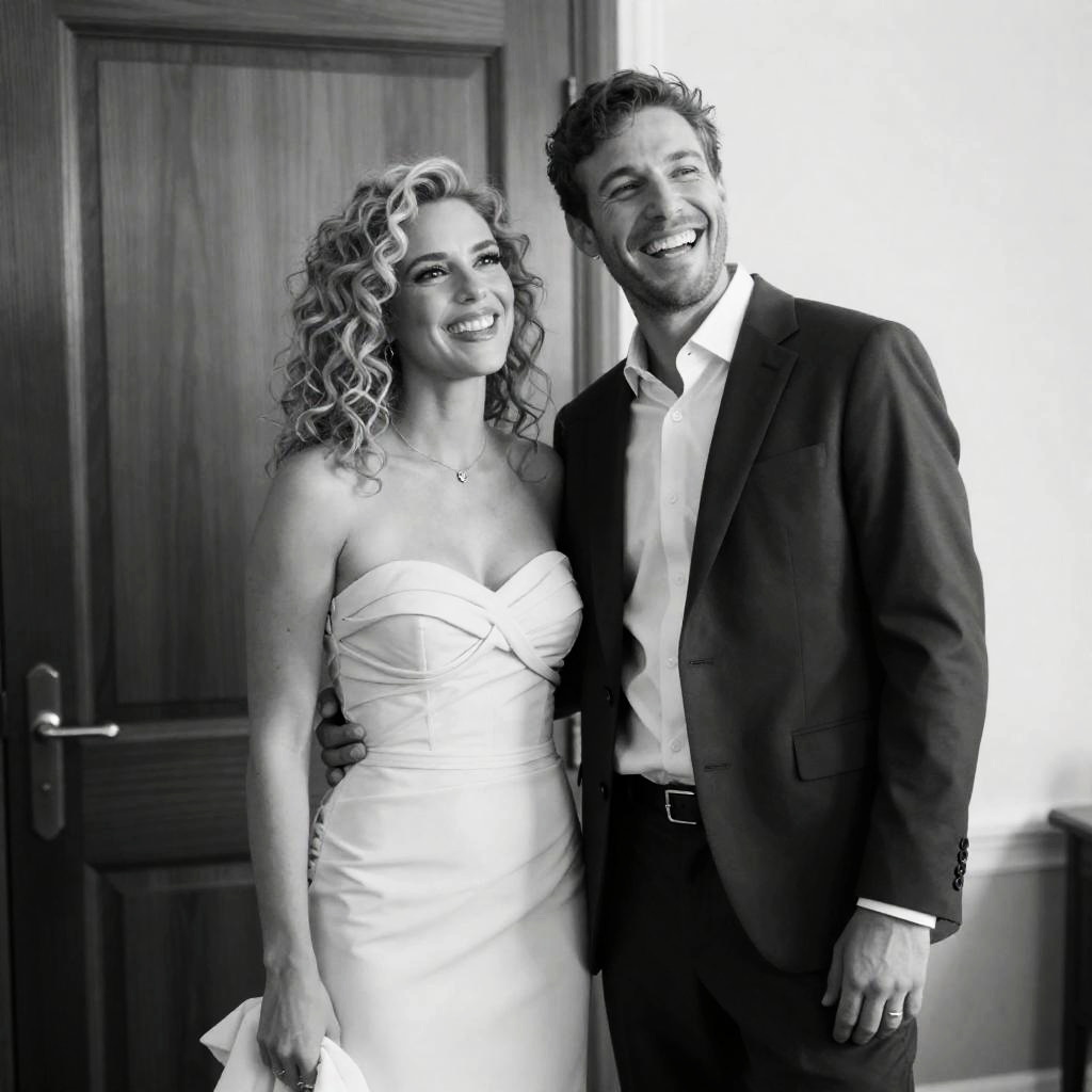 Close-up photograph of a couple in an intimate embrace against a glowing blue background. The woman has shoulder-length brown hair and is wearing a sleeveless black dress, while the man has dark hair and is dressed in a black suit. Their faces are partially obscured, highlighting the emotional connection and intensity of the moment.