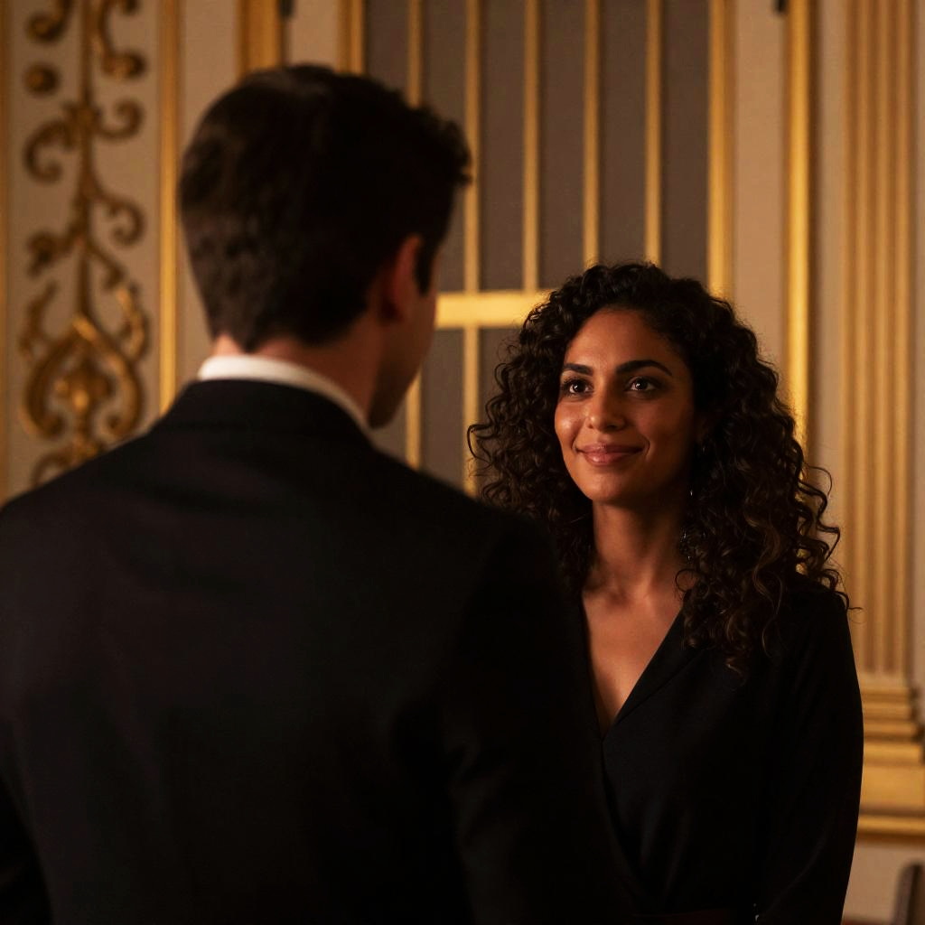 Photograph of a couple embracing. The woman with shoulder-length brown hair, wearing a sleeveless black dress, embraces a man with dark hair and a black suit. Blue, glowing light background. Man's face partially obscured, woman's face not visible. Intense, close embrace.