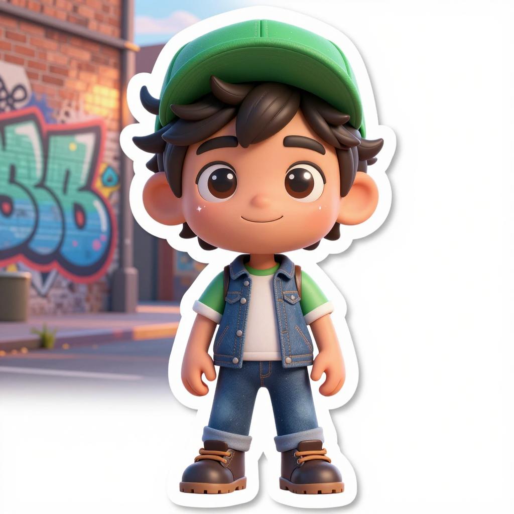 Doodle meets hyperrealistic 3d full-body sticker of tall Latino boy with messy dark brown hair and green cap wearing denim jeans and boots in urban graffiti street with brick wall and sunset glow, white background, transparent PNG, neon highlights, upscaled, big sparkling eyes, cute smiling face