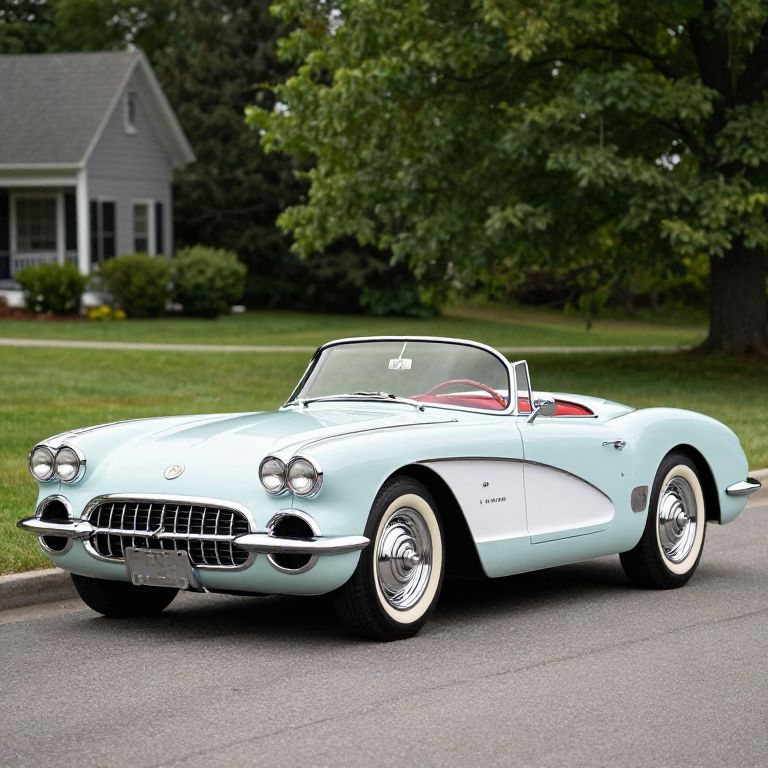 This photograph captures a classic, light blue 1950s convertible car with white-walled tires, parked on a suburban street. The car has a sleek, curved design with a chrome grille and round headlights. The top is down, revealing red leather seats. A small "50" sign is visible on the windshield. The background includes a green, well-manicured lawn, tall trees, and a grey house with white trim. The street is paved and curves slightly to the left. The image is brightly lit, highlighting the car's shiny paint and polished chrome details.