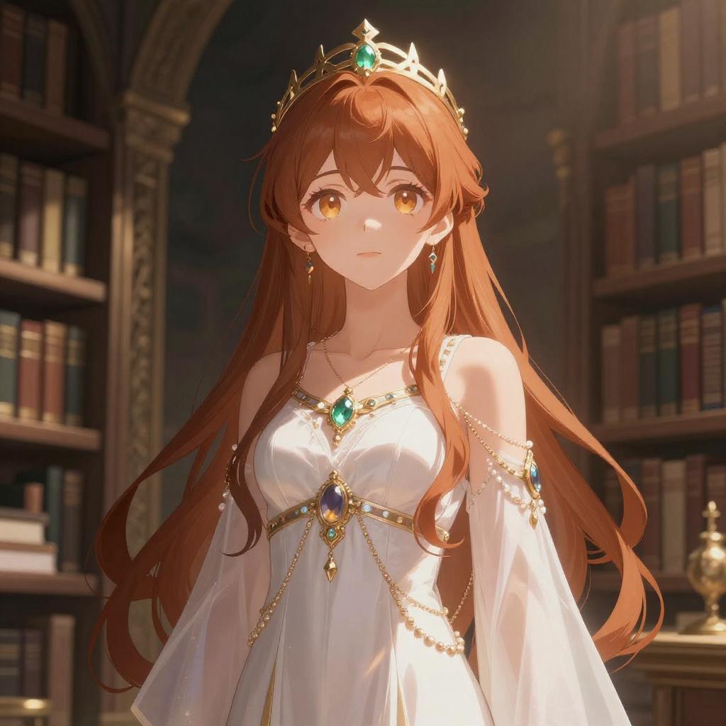 Digital anime-style illustration of a young woman with long auburn hair and large amber eyes wearing a golden crown with a central jewel. She is dressed in flowing white celestial robes adorned with a large gem and delicate chains, standing confidently in a dimly lit ancient library filled with tall bookshelves. Soft, radiant dawn light highlights her serene and peaceful expression.