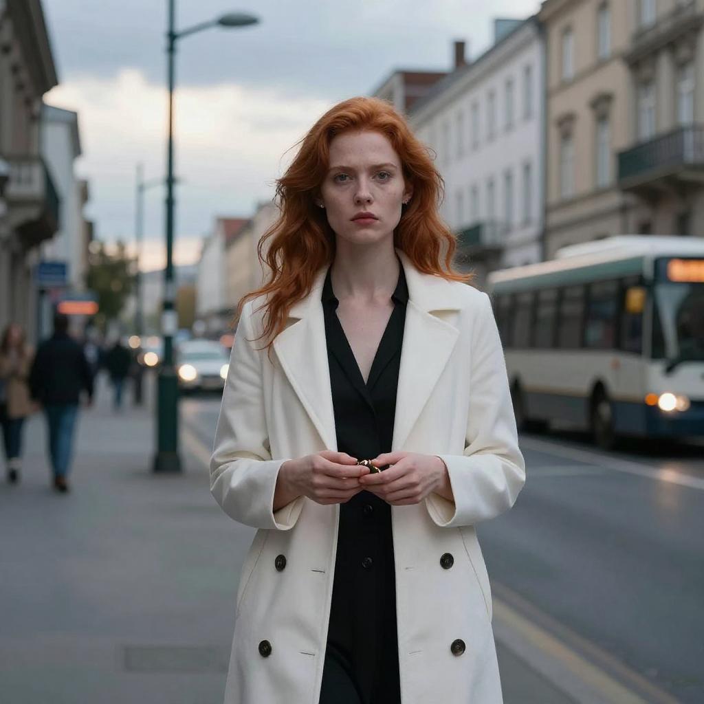 Photograph of a red-haired woman with pale skin and a serious expression, standing in an urban street. She wears a white, long coat over a black dress, holding a small object in both hands. The background shows blurred buildings, a streetlamp, and a bus. The sky is blue with sunlight peeking through, casting a cool light over the scene.