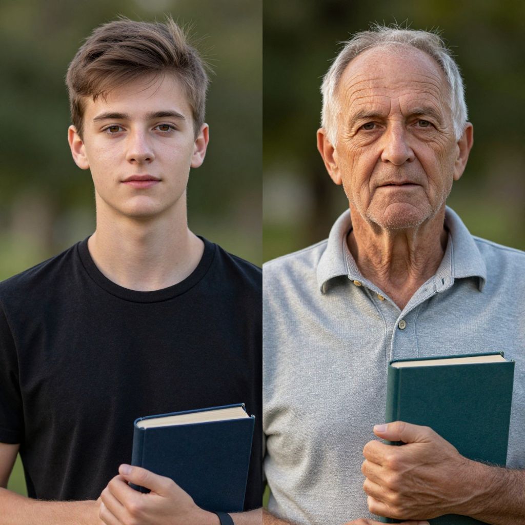 A split-image portrait of a young man and a older man in a park at golden hour: the younger man has smooth, clear skin with a fresh complexion, while the older man has deeply lined skin and slightly sun-bleached features, both holding books to symbolize the passage of time and the difference between youthful vitality and aged weathering