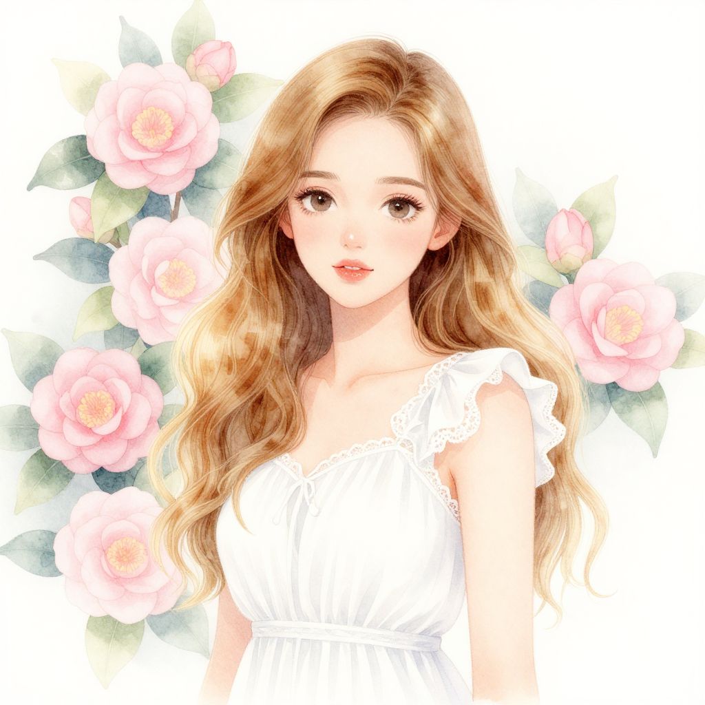 Artistic illustration of Korean monolid eyes, watercolor style, floral patterns surrounding the face, ethereal atmosphere, soft hues of pink and blue, dreamy and graceful