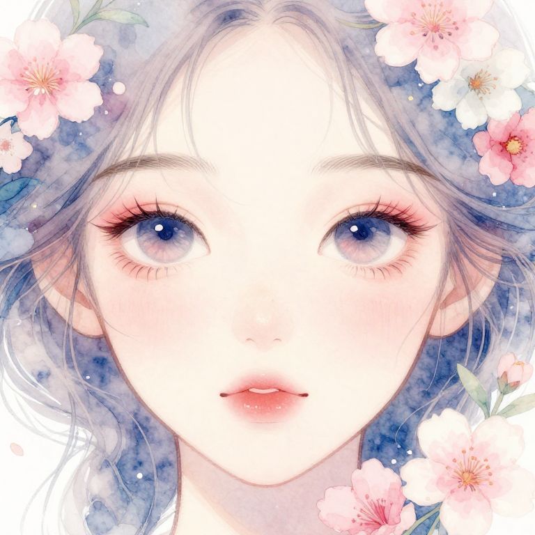Digital anime-style artwork of a young girl with large, luminous blue eyes and delicate, light pink lips. Her pale, almost white skin contrasts with her soft, wavy, lavender hair. Pink and white cherry blossoms and blue watercolor-like background elements frame her face, adding a dreamy, ethereal quality. Her long eyelashes and subtle blush enhance her innocent, serene expression. The image is vibrant and detailed, with a focus on soft, delicate colors and textures.