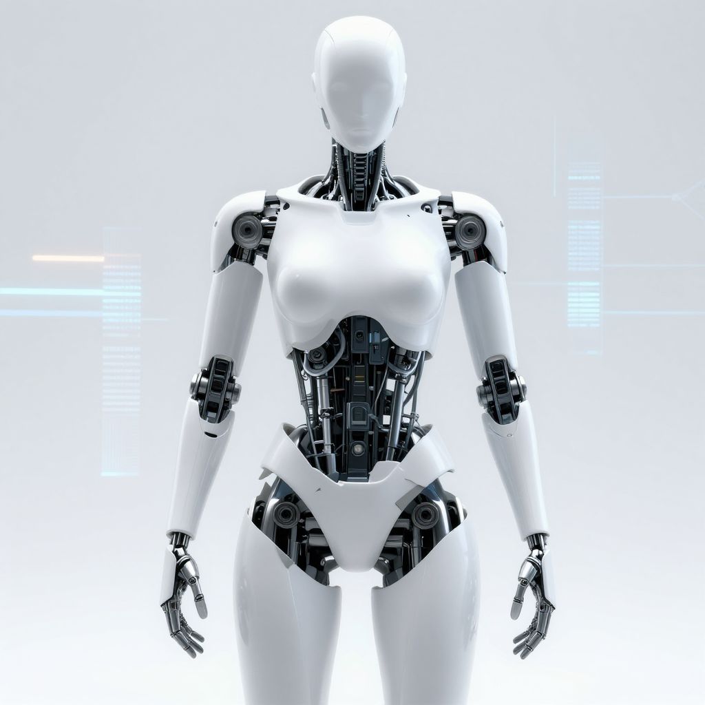 Photograph-style digital image featuring a silver humanoid robot standing behind a walking tiger. To the right, a man in a black suit with a white dress shirt and black shoes is bending slightly forward, holding the tiger's tail. The background is entirely white, providing stark contrast. The robot's metallic surface reflects light, while the tiger's fur is vibrant orange with black stripes. The man's blond hair is slightly tousled. The scene is surreal, blending elements of human, animal, and machine, creating an unsettling, futuristic atmosphere.