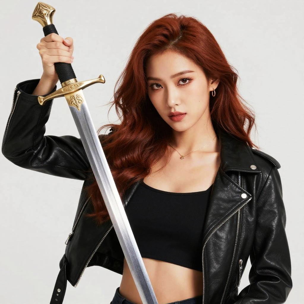 Portrait of a confident young woman with long red hair wearing a black leather jacket and black crop top, holding a medieval-style sword with a gold hilt. She poses against a plain light gray background, exuding strength and style.