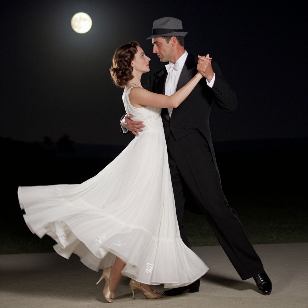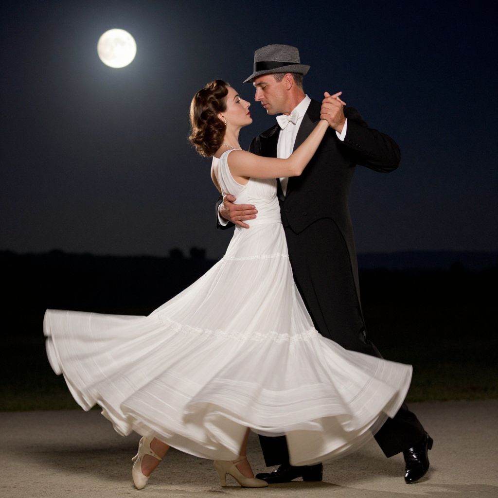 Photograph of a dancing couple under a full moon, man in black suit and hat, woman in white dress, twirling gracefully.