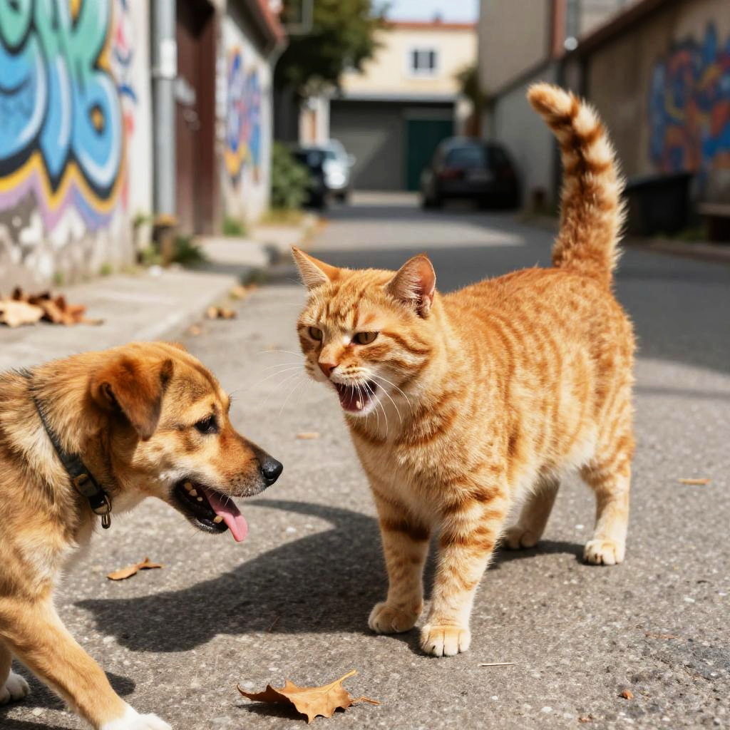 Orange cat hissing fiercely at a stray dog on a sunlit urban alleyway, graffiti walls and scattered leaves around, detailed textures on the concrete and fur, intense confrontation captured with sharp contrast and vibrant orange tones, dynamic perspective.